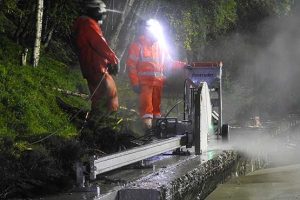 Geo-Structural team track sawing a railway platform during night shift track possessions. The platform was being cut back to make room for newer larger trains